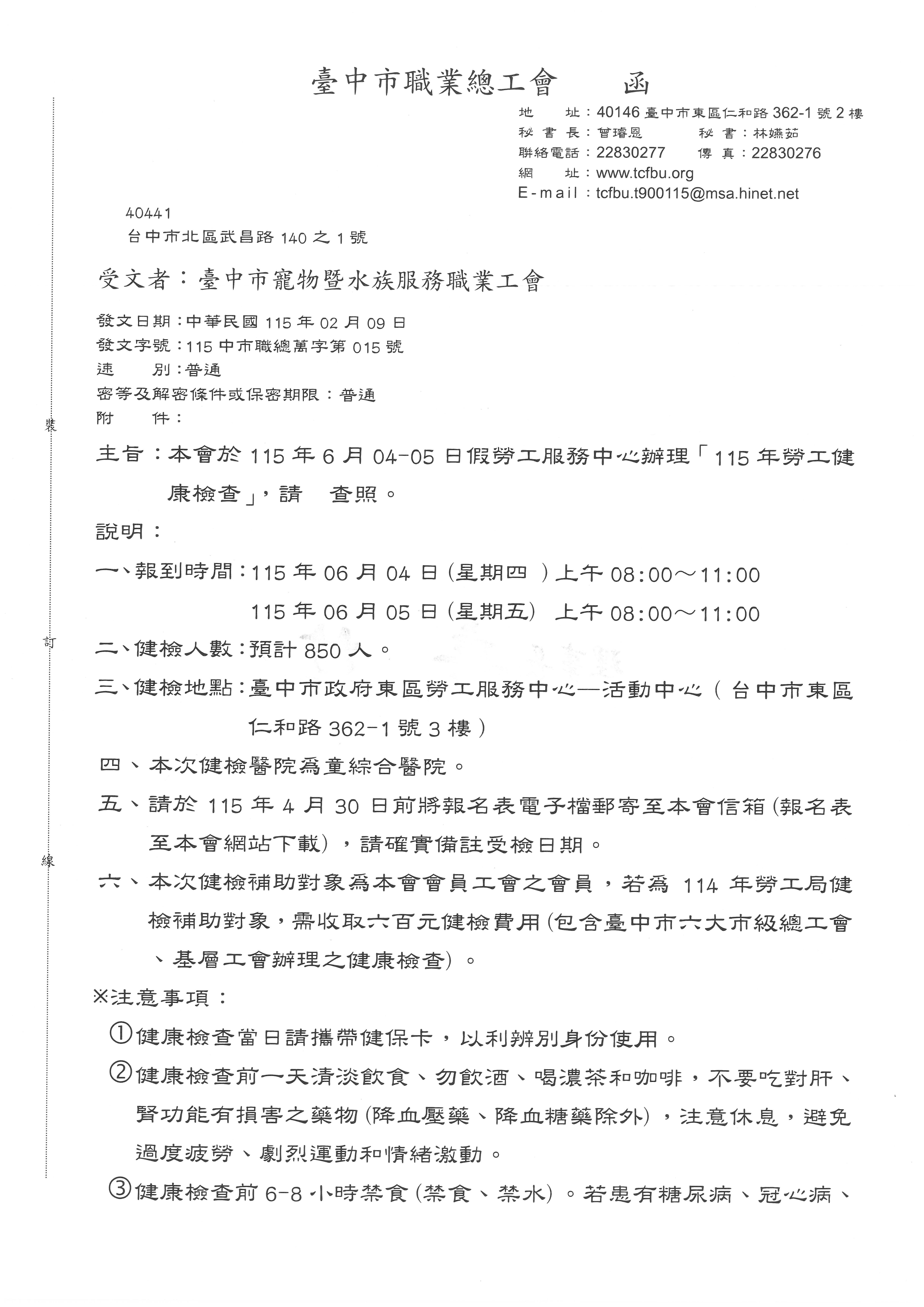 115年度勞工免費健康檢查,欲報名者請於4月30日前報名